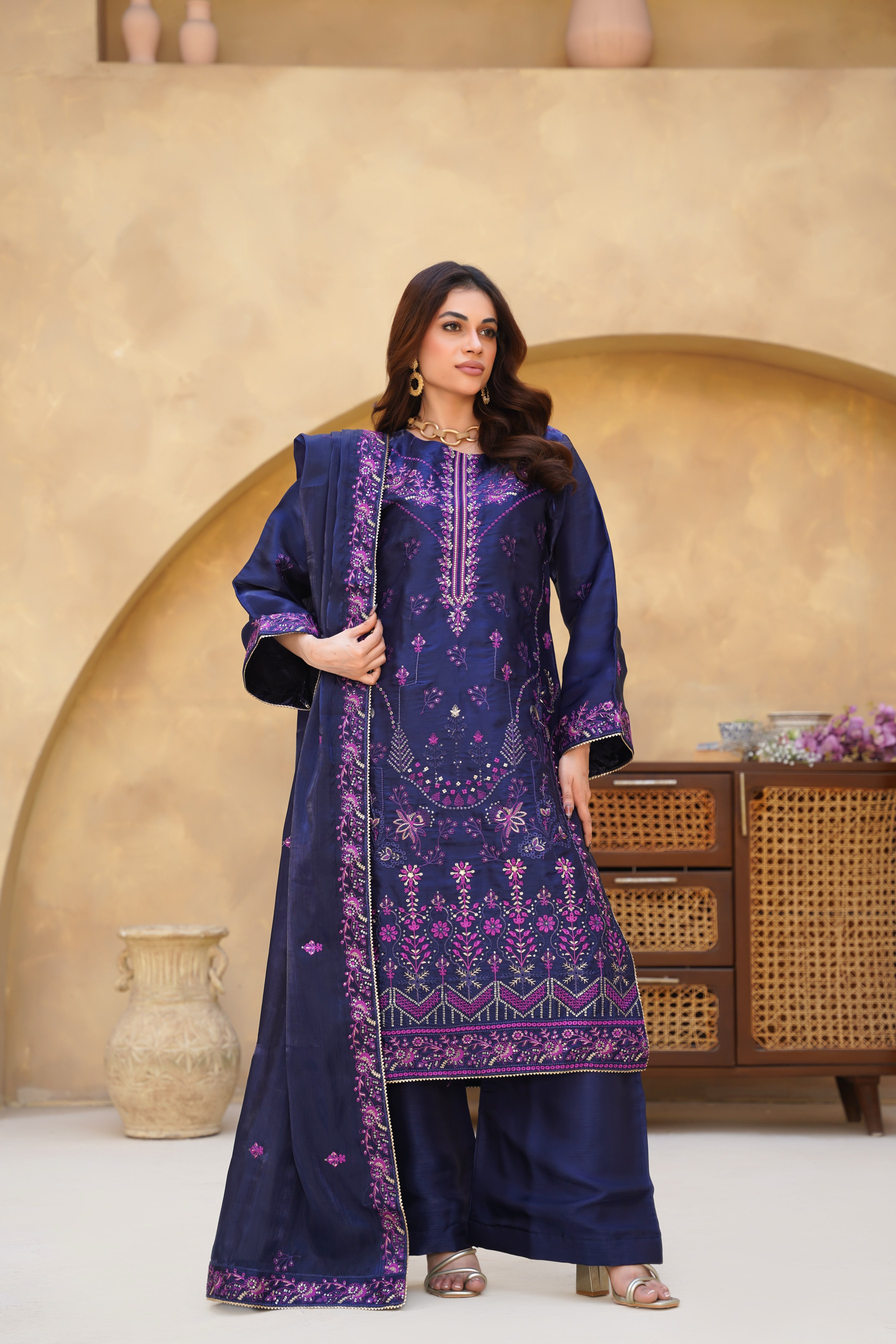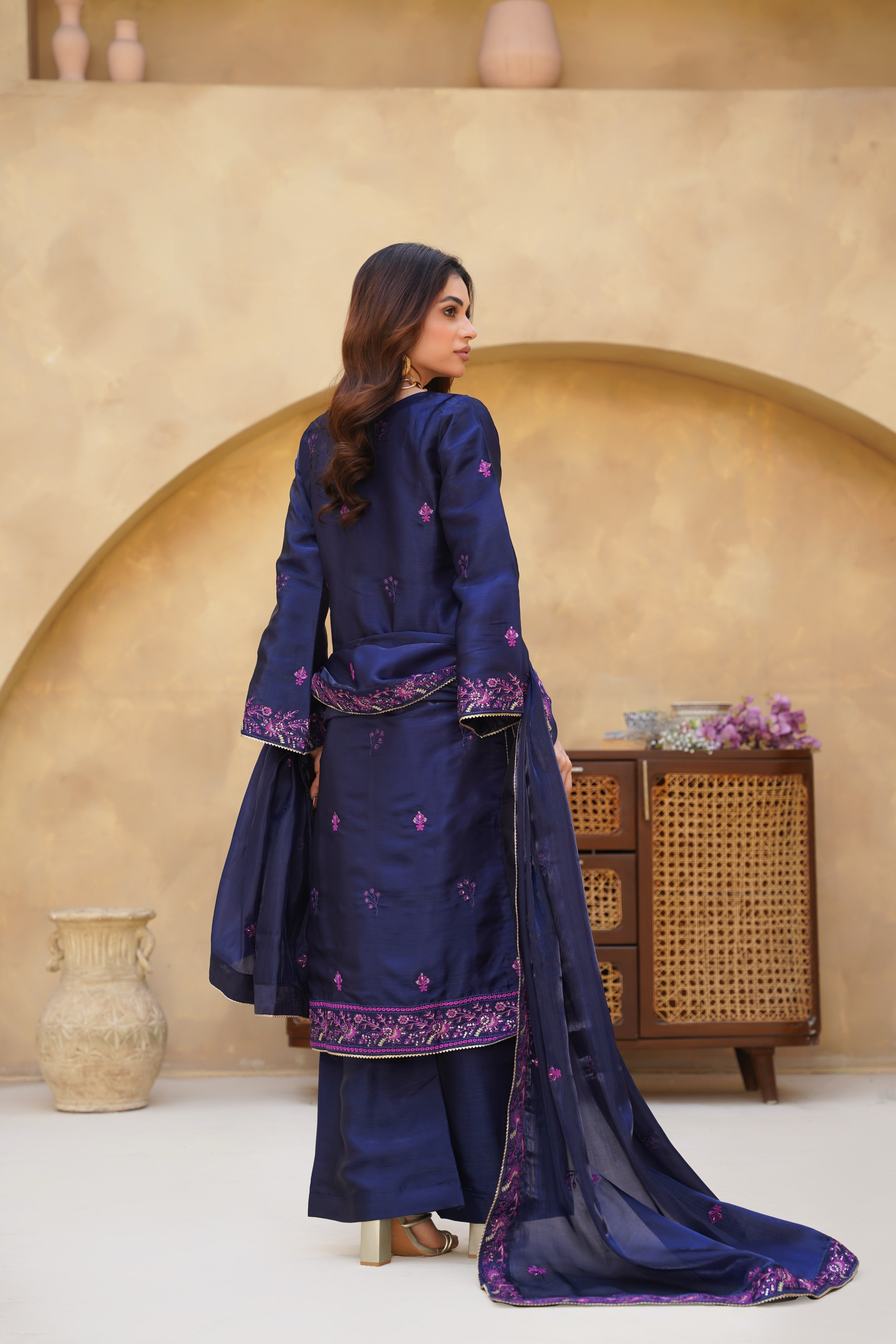 • Style: Elegant festive ensemble featuring a luminous sheen and graceful drape — designed for refined evening wear and statement occasions.