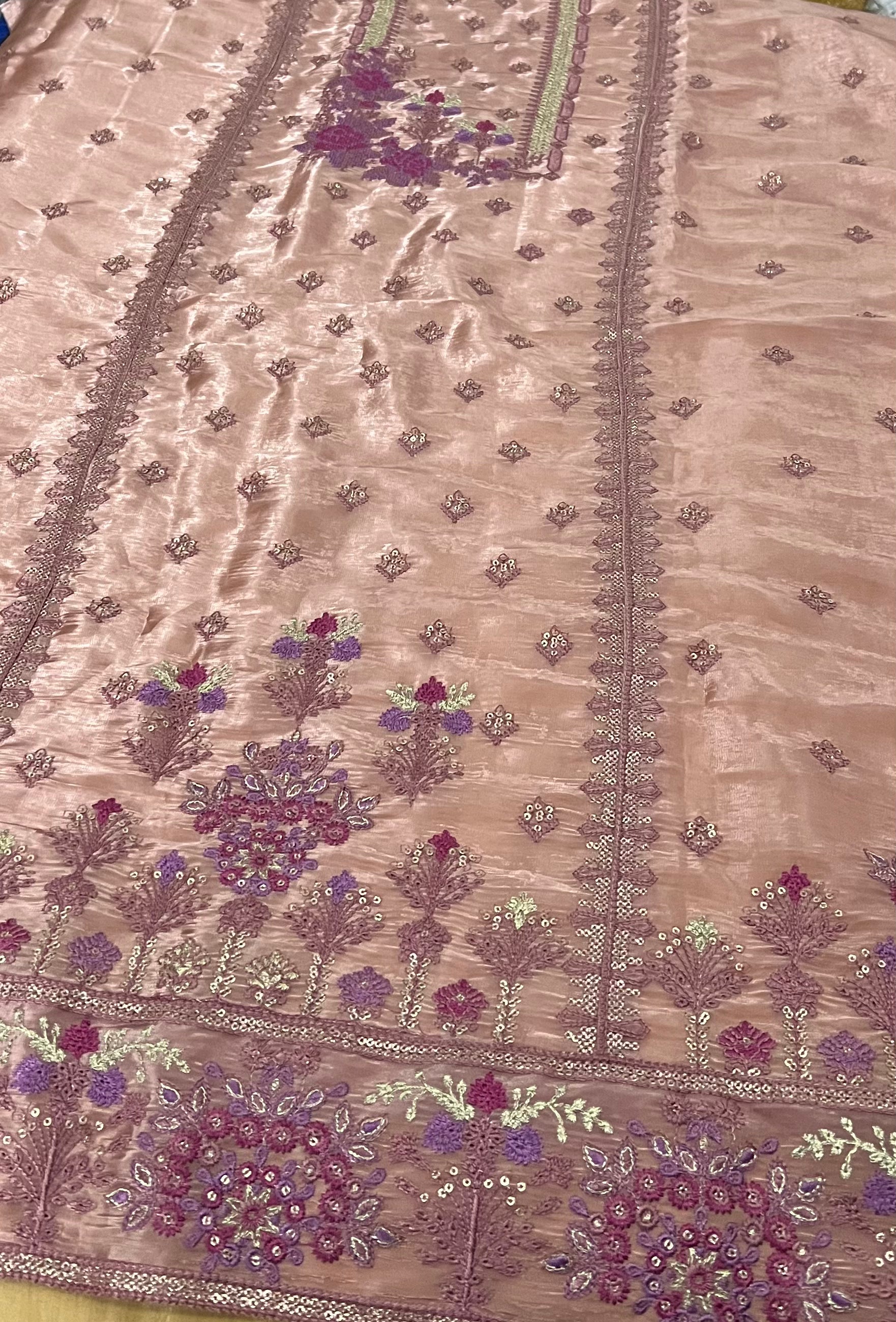 Premium sheesha silk ensemble featuring elegant tilla and sequin embroidery with a rich, heavy embroidered dupatta. Crafted with high-quality fabric and detailed workmanship, this semi-stitched outfit is perfect for festive and formal occasions.