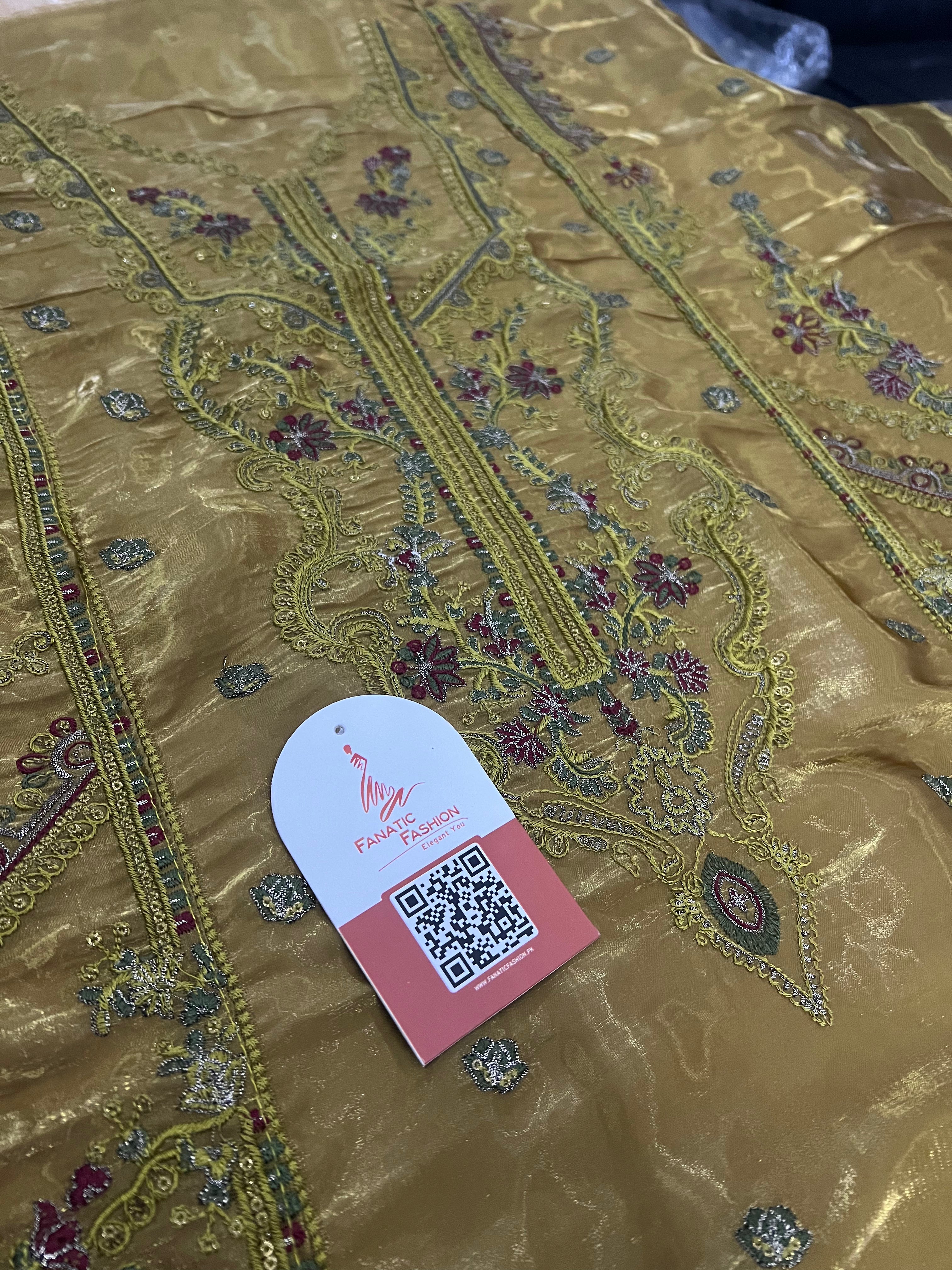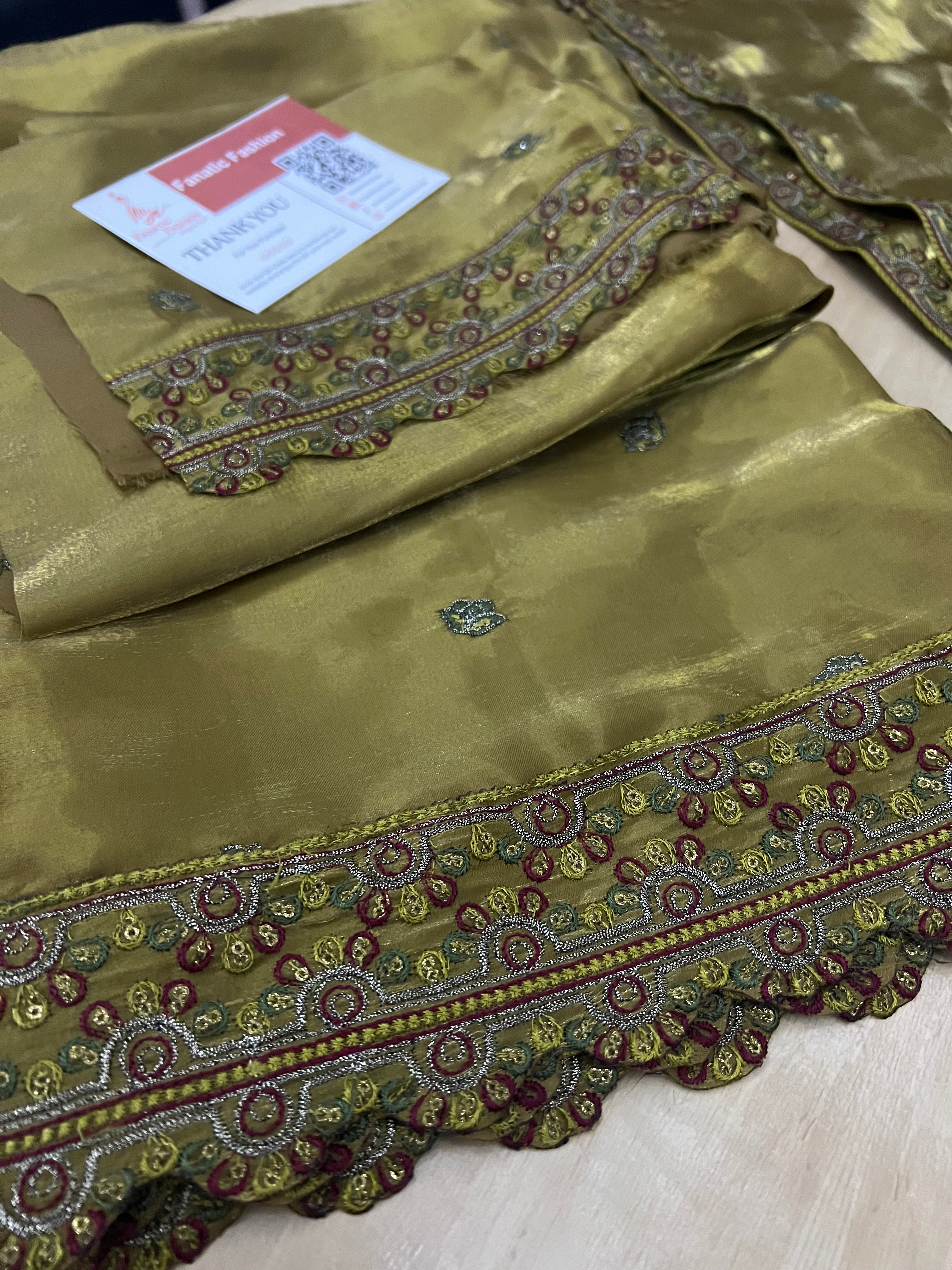 Premium sheesha silk ensemble featuring elegant tilla and sequin embroidery with a rich, heavy embroidered dupatta. Crafted with high-quality fabric and detailed workmanship, this semi-stitched outfit is perfect for festive and formal occasions.